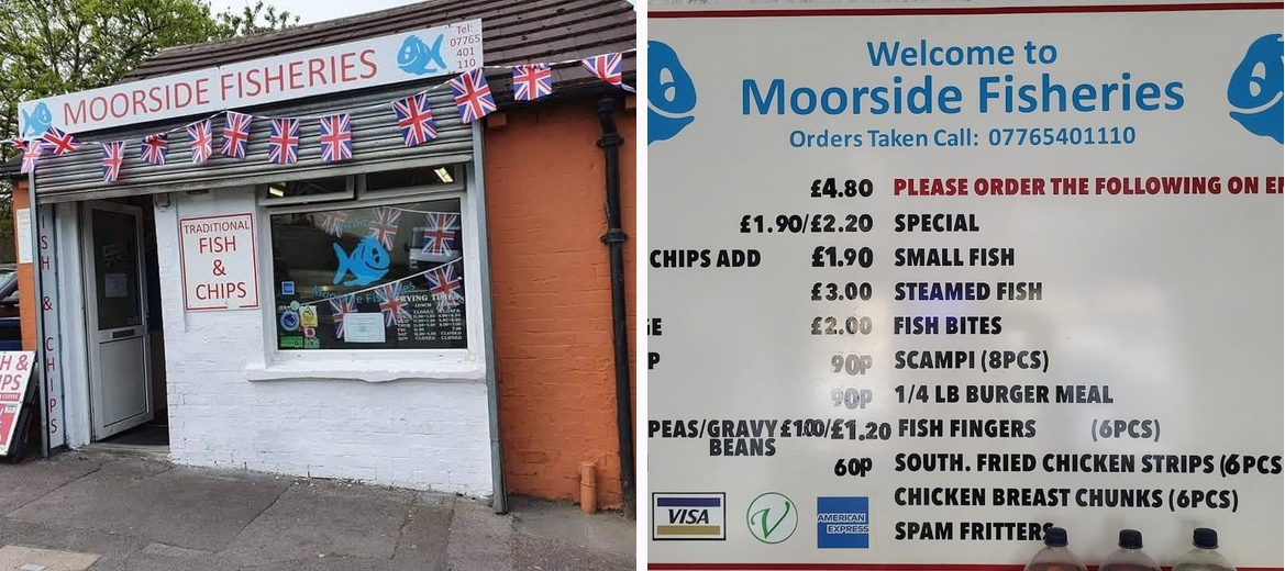 Moorside Fisheries specializes in fish and chips, offering a variety of items including fish, chips, and unique dishes like fishcakes and chicken nuggets. Halal options are also available.